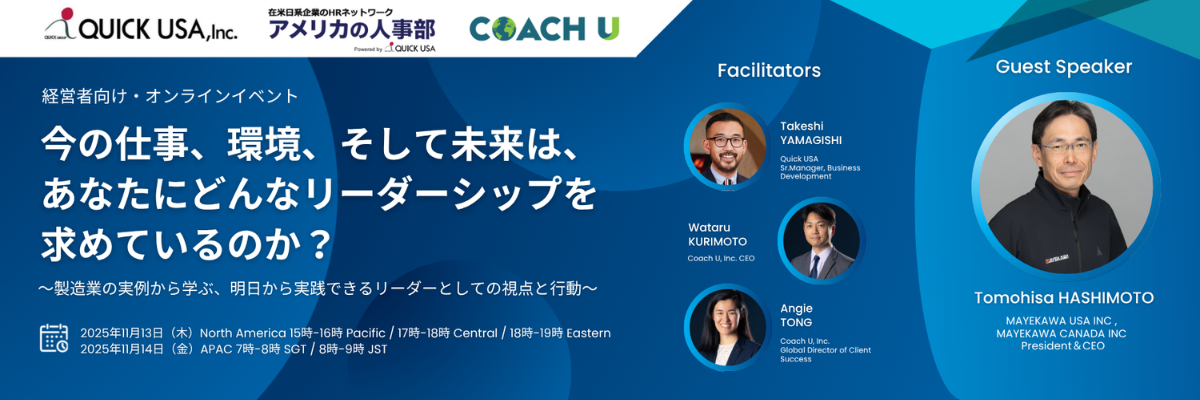 ただ、より説得力のある具体例をご紹介すべきとも思います。そこで、今回、MAYEKAWA USA INC , MAYEKAWA CANADA INC President&CEO を務める橋本様をお招きすることにしました。橋本様は、組織の変革に際し、自らコーチングを学び続け、製造現場でのリーダーシップに活かしておられます。そのマインドセットと具体的な工夫は、きっとご参考になるはずです。