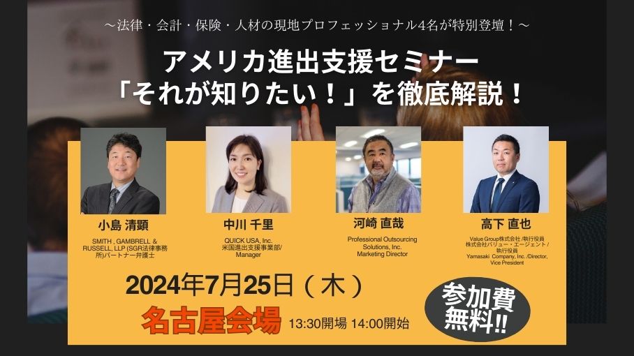 そこで、7月25日(木)名古屋にて、アメリカへの進出トレンドと、成功のポイントを余すところなくお伝えするセミナーを開催します。